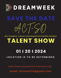 Save the Date! ACT-SO will be hosting a Talent Show during DREAMWEEK January 20th 2024! email: actsosa210@gmail.com