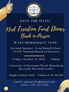 73rd San Antonio Branch NAACP Freedom Fund Dinner Date: Friday, October 27, 2023 – Time: 7:00 PM University of the Incarnate Word: Rosenberg Skyroom—McComb Center